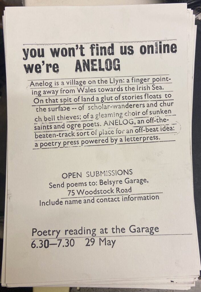 Anelog, a poetry project attached to the letterpress printer at the Garage, is hosting an evening of poetry reading and acoustic music.